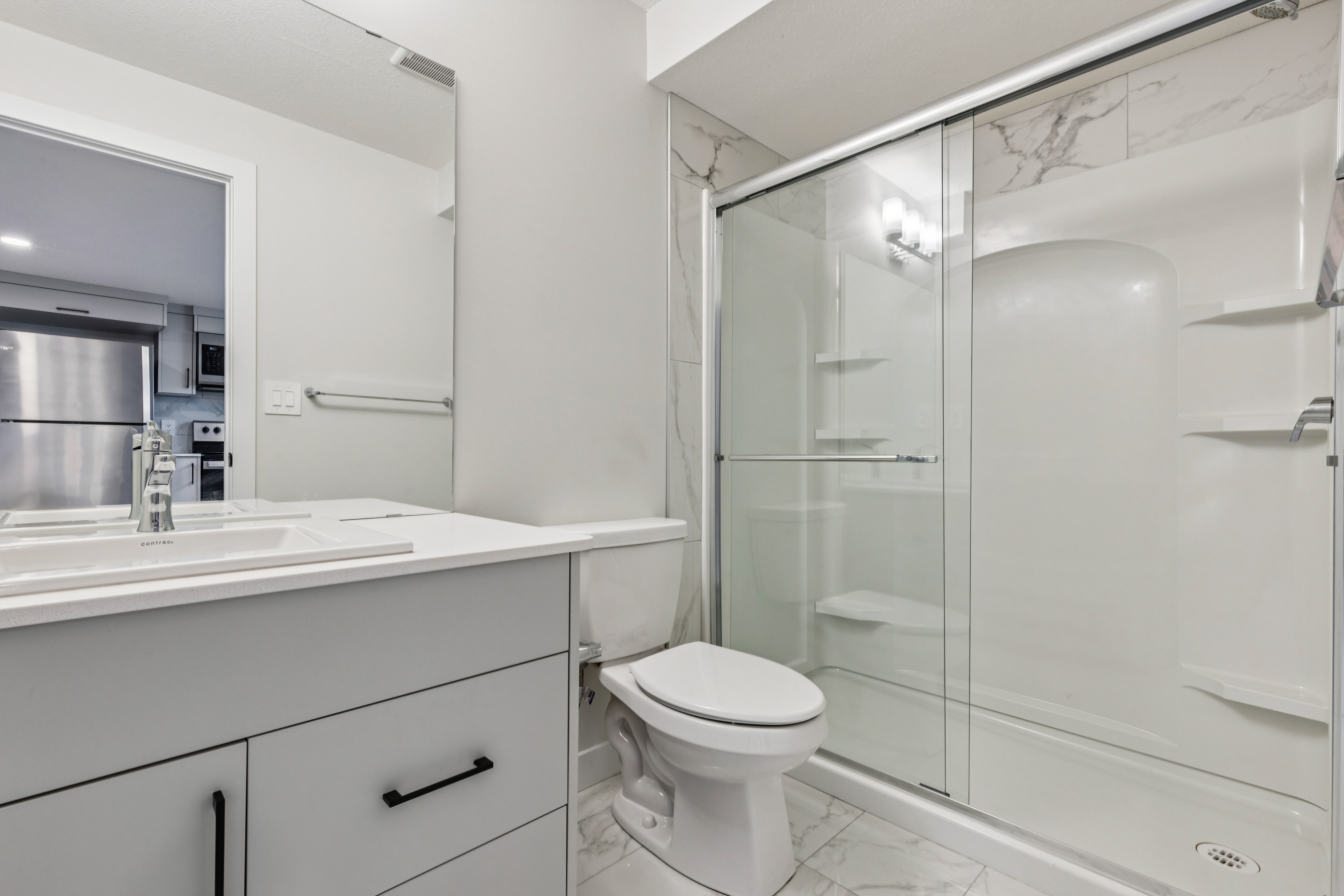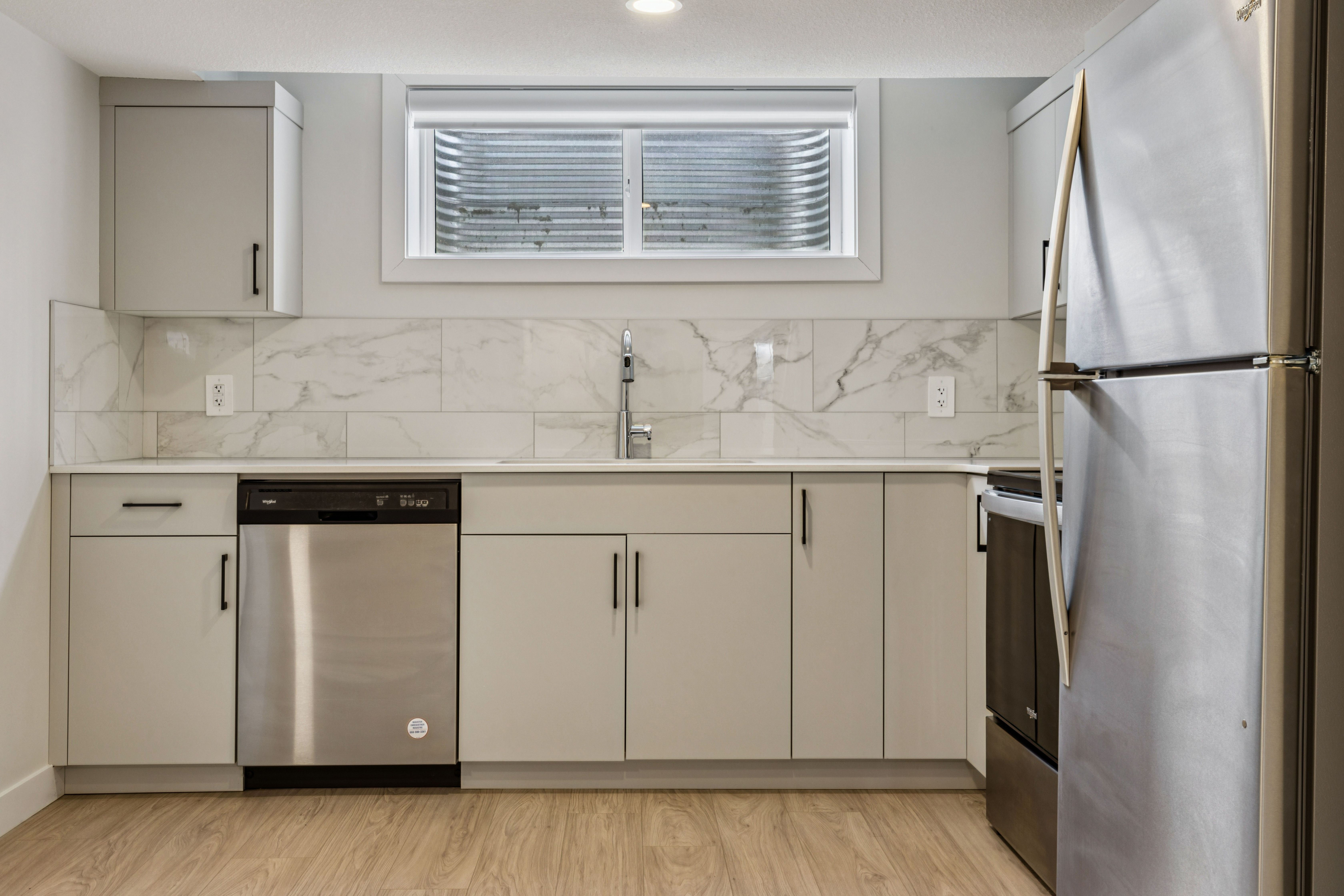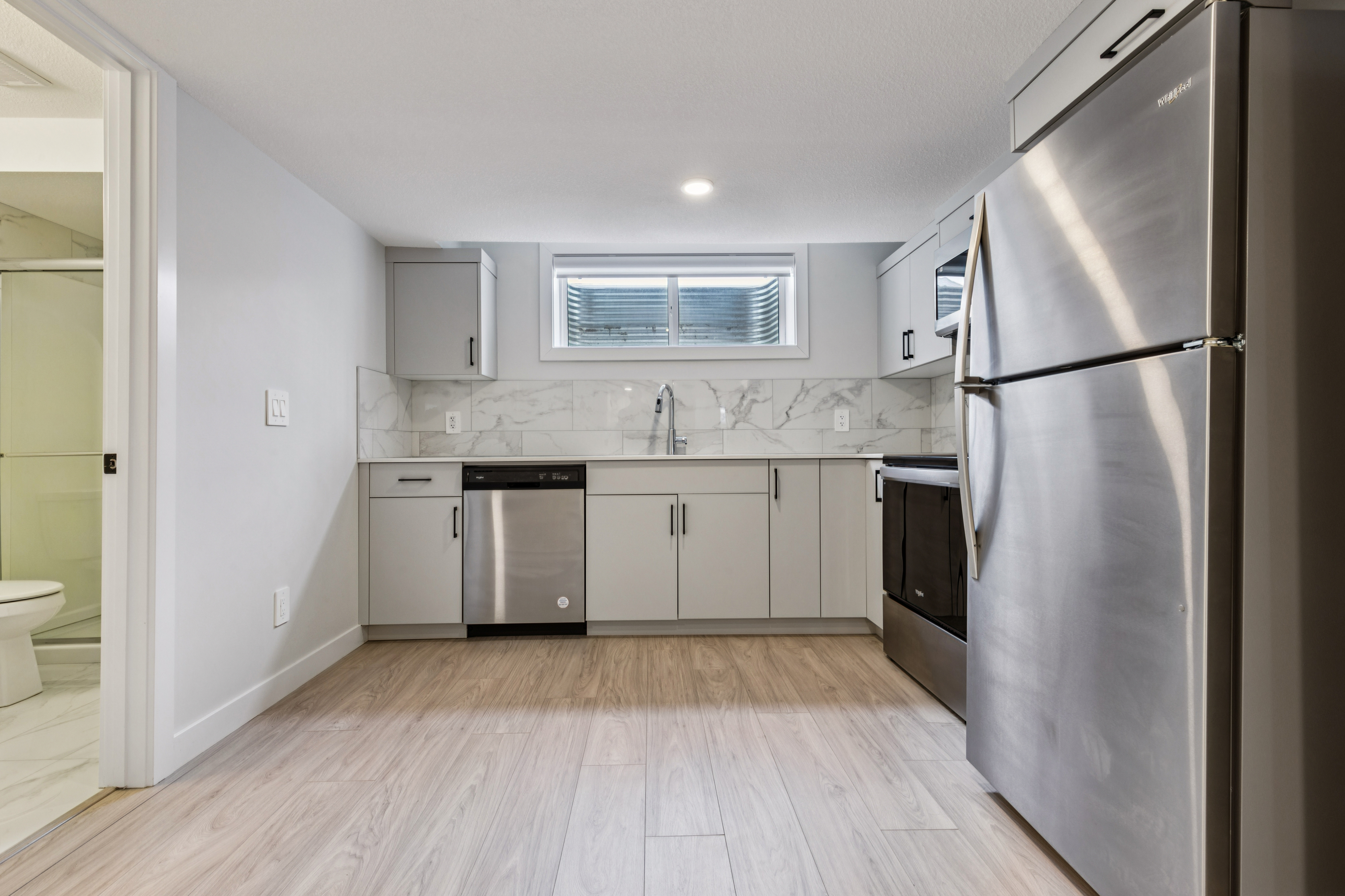 - Bright Modern Kitchen with Stainless Steel Appliances and White Cabinets